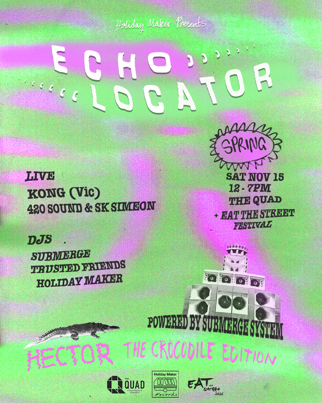 Spring 'Hector the Crocodile' edition: Saturday, 15 November 2025, 12pm - 7pmThe Quad will be rockin’ on Sat 15 Nov from 12-7pm with a full day of live music and DJs for the Spring ‘Hector the Crocodile’ edition of the Echo Locator series, coinciding with the return of Lismore’s Eat The Street Festival. Proudly presented by Holiday Maker, The Quad & Eat The Street.